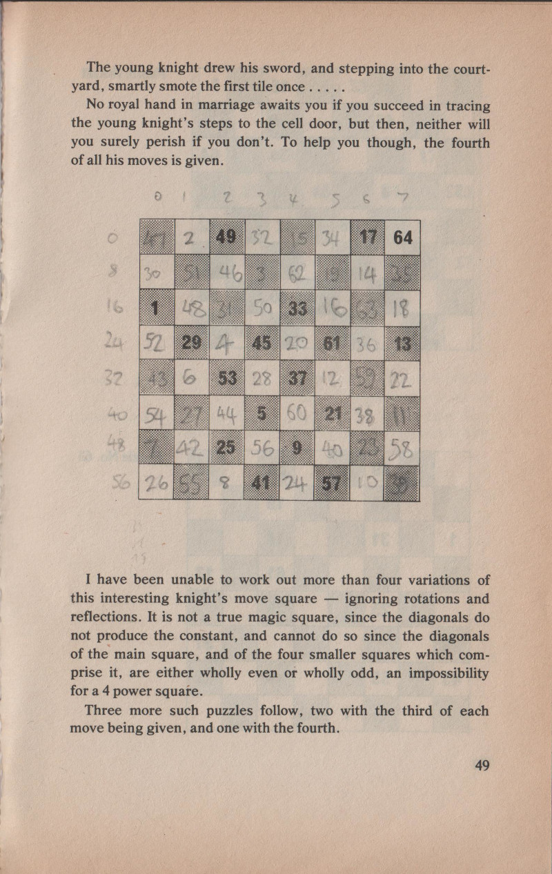 On page 48, there is a puzzle which combines a semimagic square (a square grid of numbers in which the numbers in each row and column are equal, but not the diagonals) with a knight's tour (a path taken by a chess knight which visits every square exactly once).